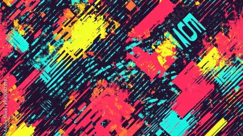 A seamless pattern with a distorted glitch effect of fragmented letters and symbols, with vibrant, contrasting neon colors