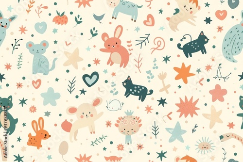 A seamless pattern with cute cartoon animals and floral elements on a cream background.