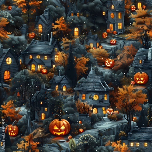 A seamless pattern.A detailed illustration featuring a whimsical Halloween scene with jack-o'-lanterns, haunted houses, and eerie trees, rendered in seamless vector style against a solid black