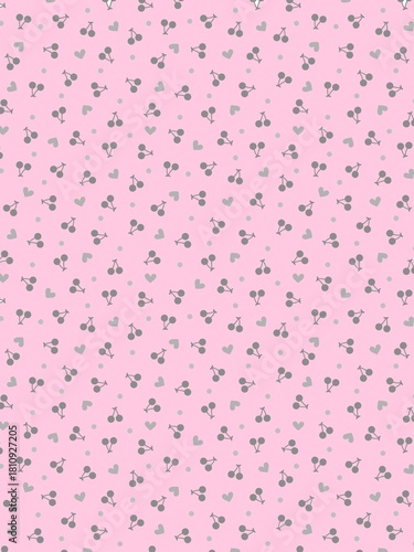 A seamless pink pattern featuring simple gray heart shapes, dotted branches, and small circle elements. The soft pastel style creates a cute and playful aesthetic