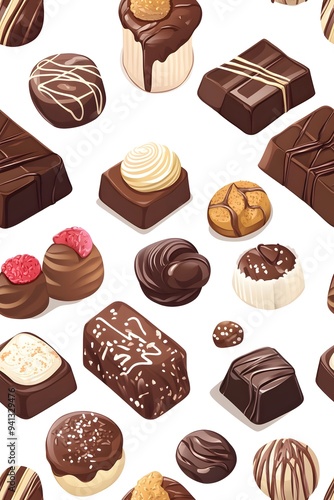 A seamless vector pattern featuring various chocolates in flat colors against a white background, showcasing a playful and stylish design.......