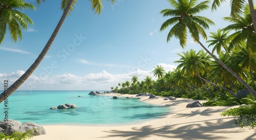 A secluded tropical beach paradise, an idyllic coastal escape with crystal-clear turquoise water and lush palm trees