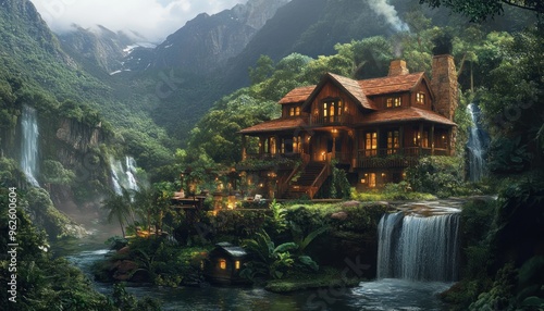 A Secluded Wooden Cabin Nestled in a Lush Forest Valley with Multiple Waterfalls