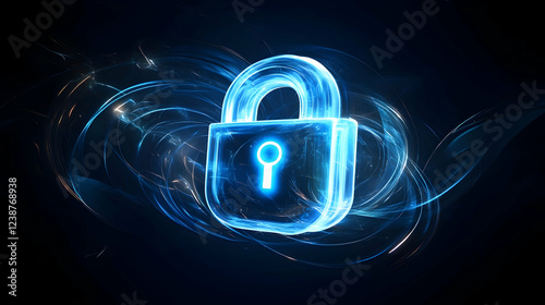 A secure lock symbol shining in neon blue with swirling holographic encryption effects on a dark background
