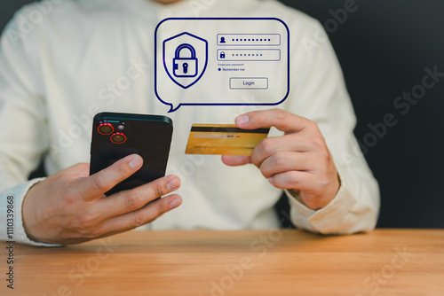 A secure online payment concept featuring a person holding a smartphone and credit card, with a login interface and padlock icon indicating digital security.