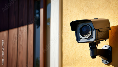 A security camera installed outdoors on a light-textured wall, illuminated by natural sunlight, ideal for articles or advertisements on home security and surveillance technology