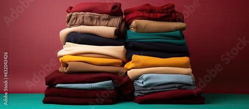 A selection of colorful folded sweaters is positioned on a brown maroon background, providing plenty of space for text or other content.