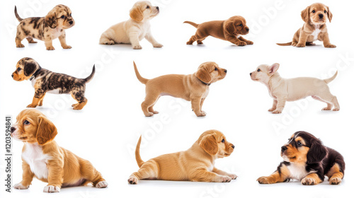 A selection of playful puppies, featuring different breeds like dachshunds, spaniels