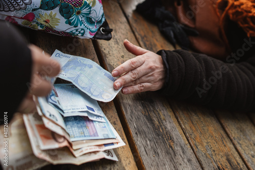 A selective focus shot of euro banknotes on wooden table with man's hand