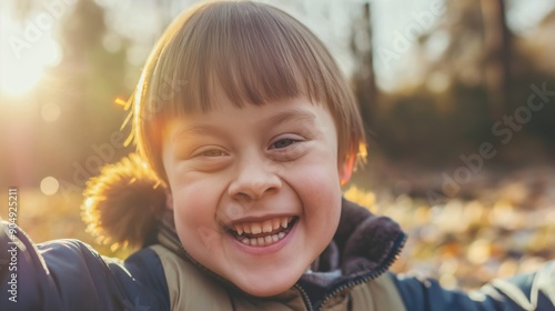 A selfie portrait of a happy child with Down's Syndrome
