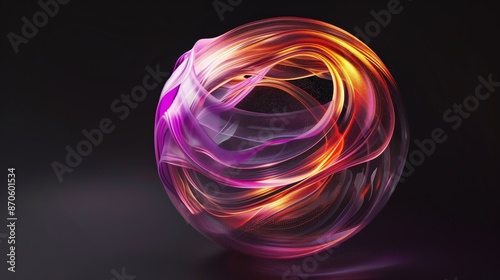 A semi-transparent gradient sphere made of purple and orange wavy lines, on a black background.