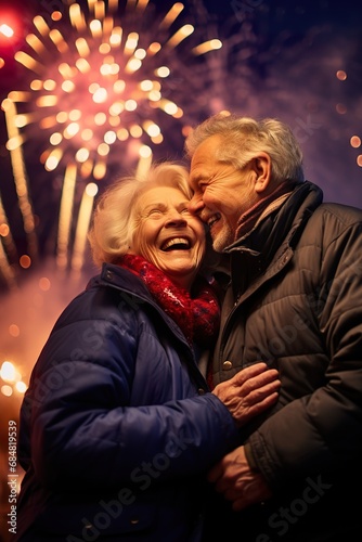 A senior couple embracing each other, laughing and enjoying a romantic moment, with colorful New Year's fireworks sparkling in the background, symbolizing enduring love and shared joy