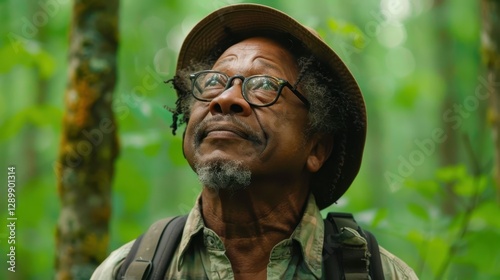 A senior man stands in a dense forest, gazing upwards with a thoughtful expression. Sunlight filters through the trees, creating a serene atmosphere as he enjoys the beauty of nature