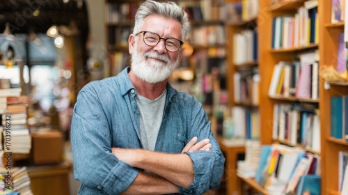 A senior man with glasses stands proudly in a quaint bookstore. Surrounded by stacks of books, he exudes warmth and friendliness, creating an inviting atmosphere for customers.