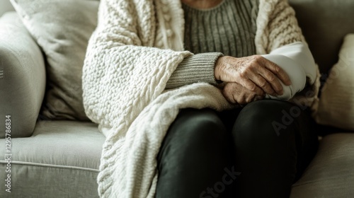 A senior with an elbow injury relaxing on a couch with a supportive arm sling. Featuring recovery and support