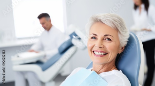 A senior woman sitting in a dental chair smiles confidently, reflecting a positive and reassuring experience at the dental clinic.