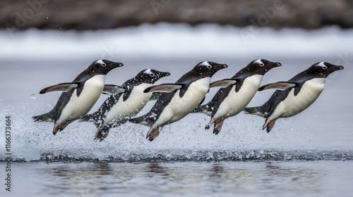 A sequence of penguins leaping out of the water, showcasing their agility and grace.
