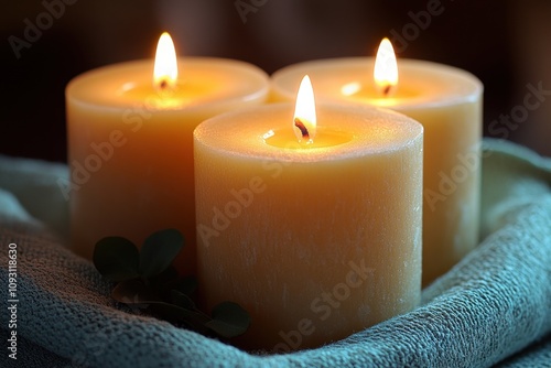 A serene and calming scene featuring three softly glowing candles placed on textured fabric, creating a warm and tranquil ambiance