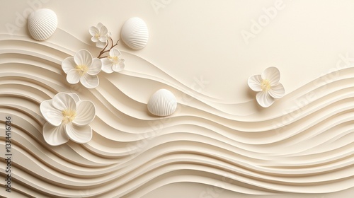 A serene and elegant wallpaper design featuring a harmonious blend of white flowers and seashells, creating a calming and soothing atmosphere.