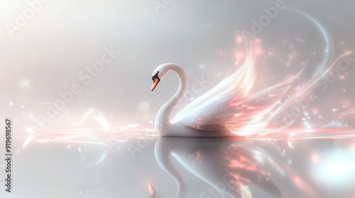 A serene and majestic swan gliding gracefully over a reflective water surface, with ethereal glowing wings and sparkles, creating a magical and peaceful ambience.