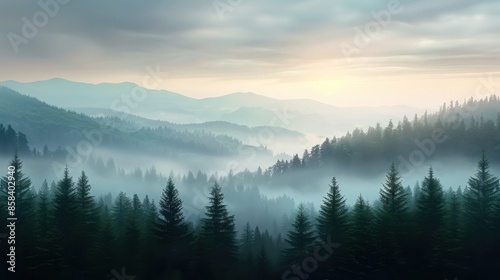 A serene and peaceful scene of a forest with a misty atmosphere. The sky is cloudy, and the sun is setting, casting a warm glow over the landscape. The trees are tall and dense