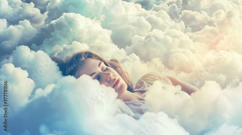 A serene and tranquil scene depicts a young woman sleeping blissfully on fluffy clouds beneath a clear blue sky