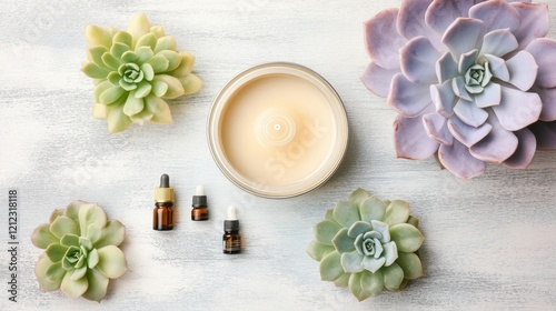 A serene arrangement featuring a candle, essential oils, and succulent plants.
