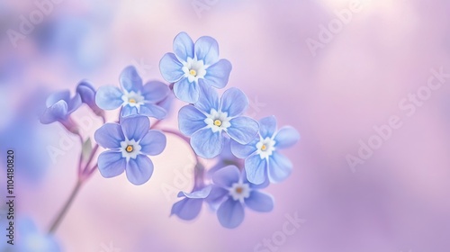 A serene arrangement of blue forget-me-nots on a subtle lavender background, soft-focus shot, Ethereal style