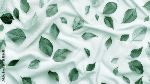 A serene arrangement of green leaves scattered across a soft, textured background, evoking a natural and calming atmosphere.