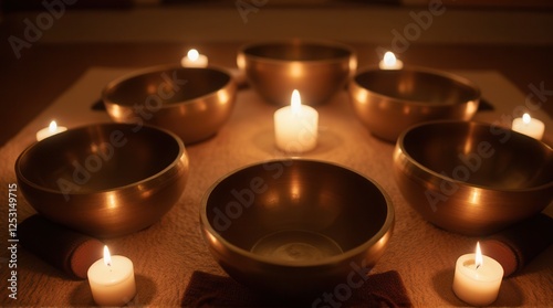 A serene arrangement of singing bowls and candles, creating a tranquil atmosphere for meditation and relaxation.