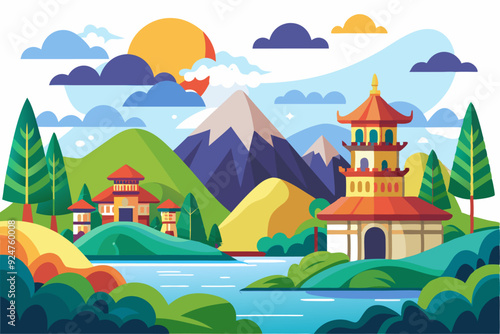 A Serene Asian Landscape with a Pagoda, Mountains, and a River