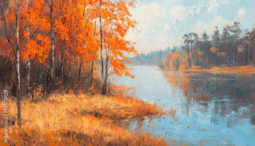 A serene autumn landscape featuring vibrant orange trees by a calm river, reflecting the beauty of nature.