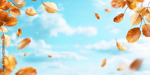 A serene autumn scene featuring floating orange leaves against a bright blue sky scattered with fluffy clouds.