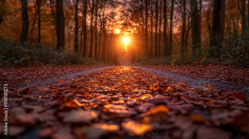 A serene autumn scene with a sunlit path surrounded by colorful fallen leaves.
