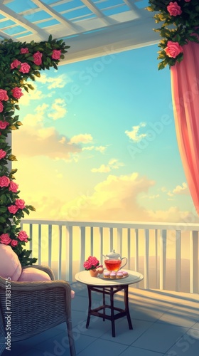 A serene balcony scene at sunset featuring a cozy chair, a small table with a cup of tea, and blooming flowers against a backdrop of soft clouds and warm hues.