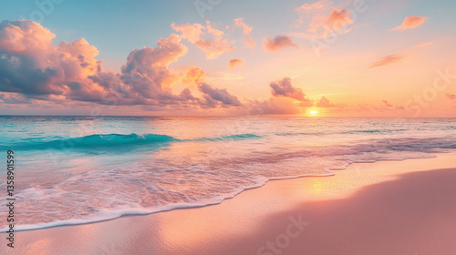 a serene beach at sunset with gentle waves lapping at the shore, the sky painted in warm hues of orange and pink, evoking a sense of calm and tranquility