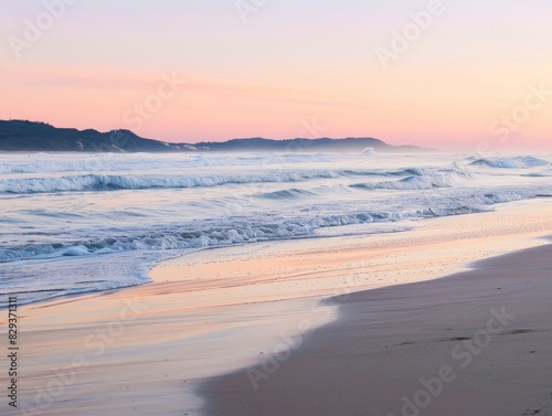 A serene beach scene at dawn with soft waves gently lapping the shore and a colorful sunrise in the background