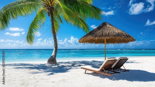 A serene beach scene featuring two lounge chairs positioned beneath a thatched umbrella, inviting relaxation and enjoyment of the coastal atmosphere.