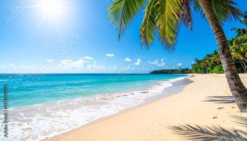 a serene beach scene with a tropical vibe. a sandy beach stretches out towards the clear blue ocean, where waves are gently lapping against the shore