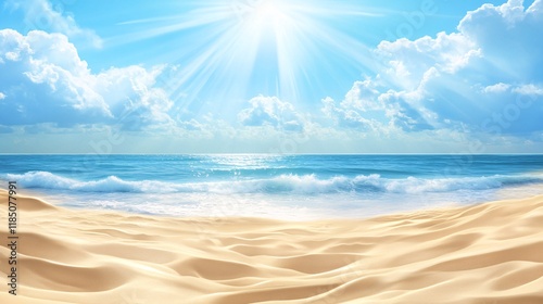 A serene beach scene with soft golden sands and sparkling turquoise waters under a bright blue sky.
