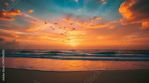 A serene beach sunset scene in warm golden hues