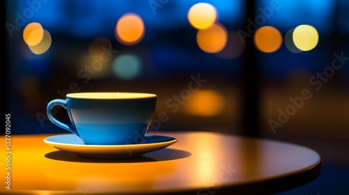 A serene blue coffee cup sits on a wooden table, illuminated by soft evening light in a cozy café
