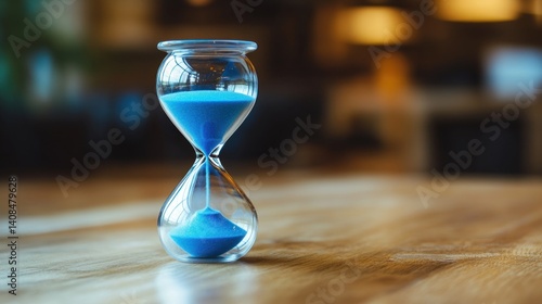 A serene blue hourglass stands still on a wooden table, symbolizing the delicate passage of time in moments of deep contemplation