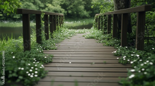 A serene boardwalk covered with wild greenery leads to a tranquil pond, inviting peaceful exploration and connection with nature.