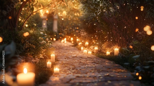 A serene, candle-lit path surrounded by glowing orbs and lush greenery, creating a magical and inviting atmosphere.
