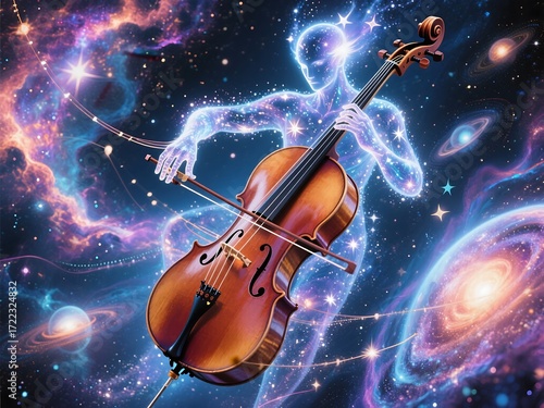 A Serene Celestial Being Playing a Cello Amongst the Galaxies and Swirling Nebulae