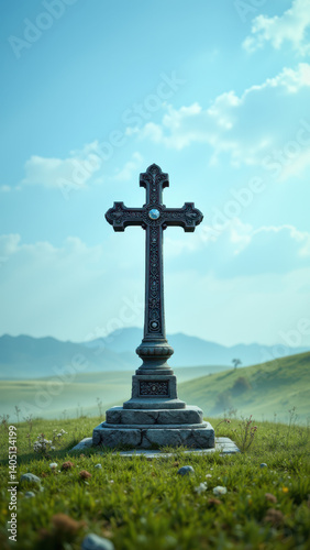 A serene Christian gravestone amidst a lush green landscape under a clear blue sky.