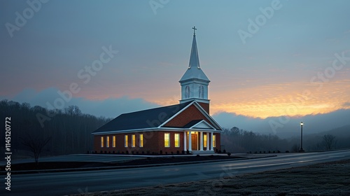 A serene church at dawn, illuminated warmly against a misty landscape.