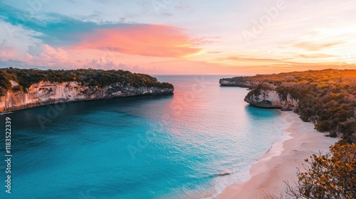 A serene coastal scene featuring a calm turquoise bay, sandy beach, and a vibrant sunset sky, perfect for relaxation and natural beauty.