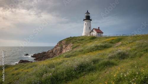 A serene coastal view featuring a historic lighthouse overlooking rocky shores and lush green hills under a dramatic sky in Maine